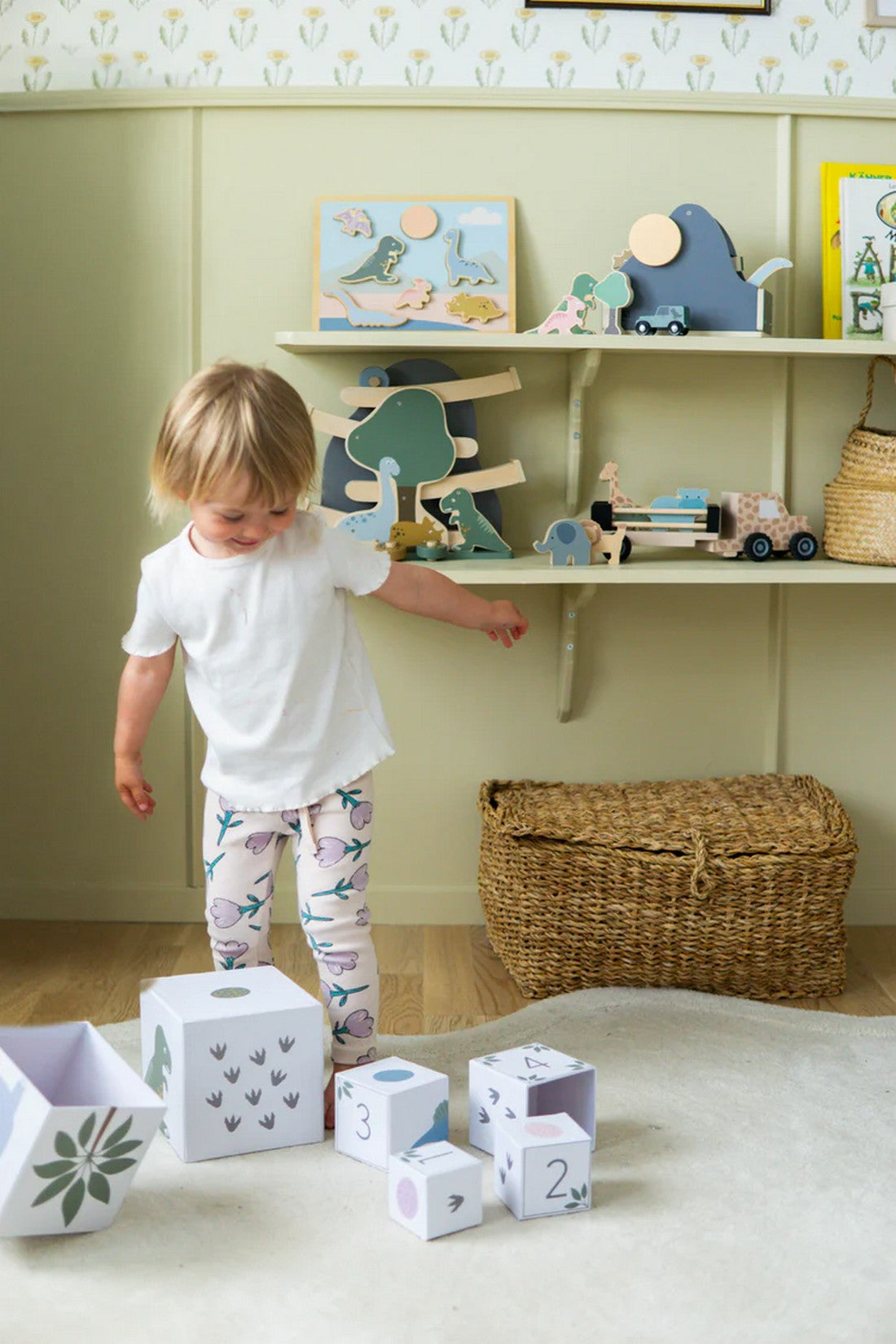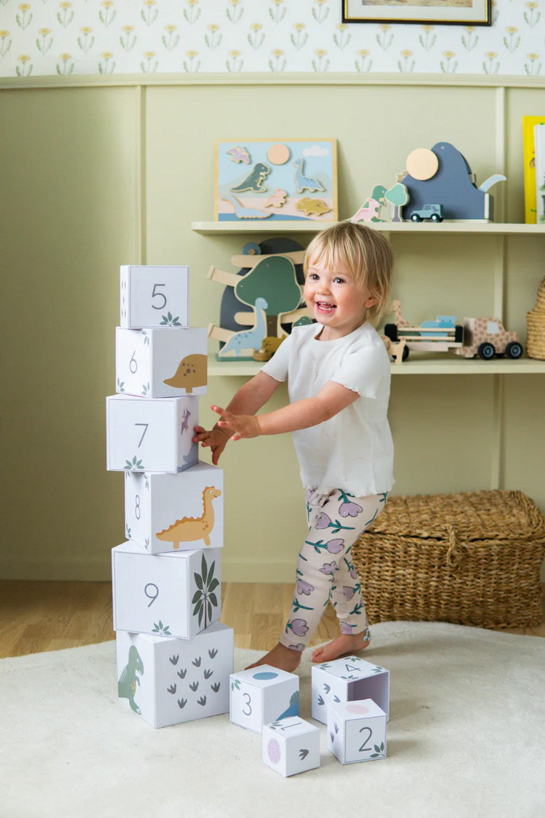 Discover, stack, and learn with this beautiful dinosaur-themed stacking tower! The ten sturdy cubes in different sizes invite creative play, allowing children to build tall towers, count, and explore colorful designs featuring fascinating dinosaurs. Each side of the cubes includes different educational elements—numbers, dinosaur tracks, and playful illustrations that inspire imagination and motor skill development. A perfect combination of play and learning that helps children develop coordination and an understanding of size and quantity. Designed in a lovely beige color to fit any child's room. A timeless toy that will be a favorite for years to come!