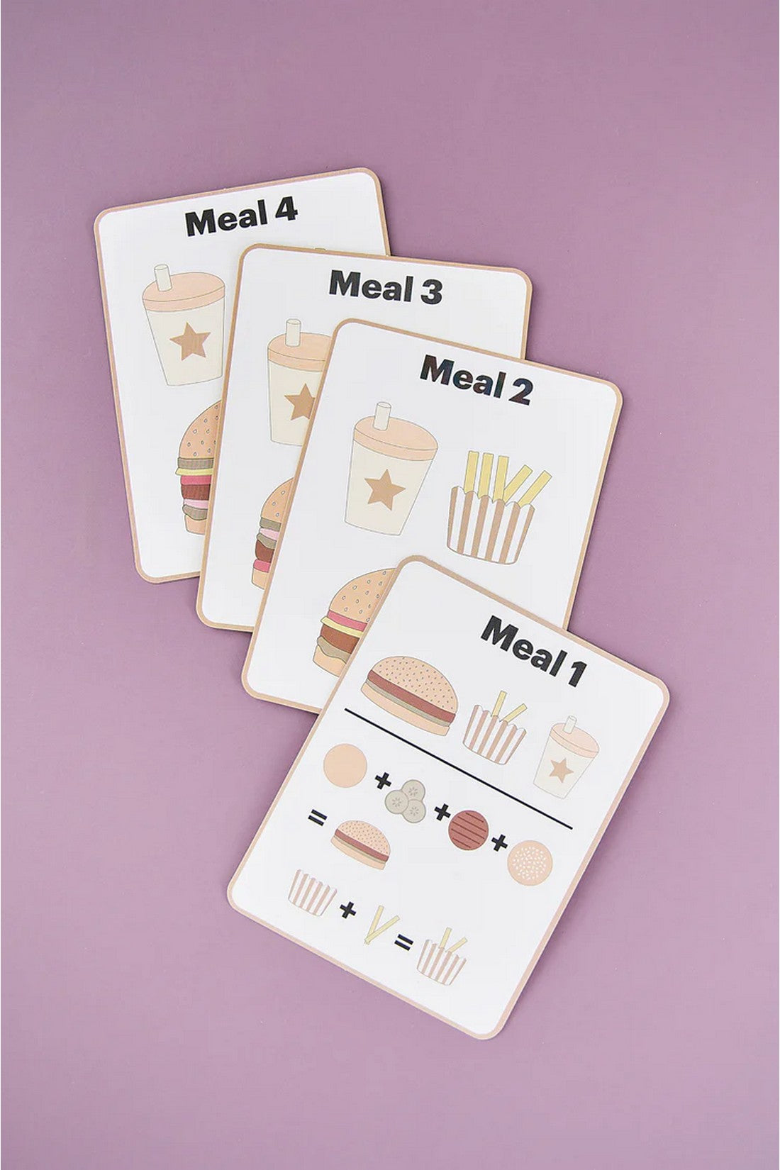A complete hamburger meal for the little hungry one. With our imaginative burger meal, you can serve several tasty meals inspired by the included menu cards. The burger is stackable, and the child chooses for himself which goodies to include in each menu. Four menu cards suggest different combinations of the burger, the fries, and the accompanying drink. Only the child's imagination sets the limits. Encourages creative playing.