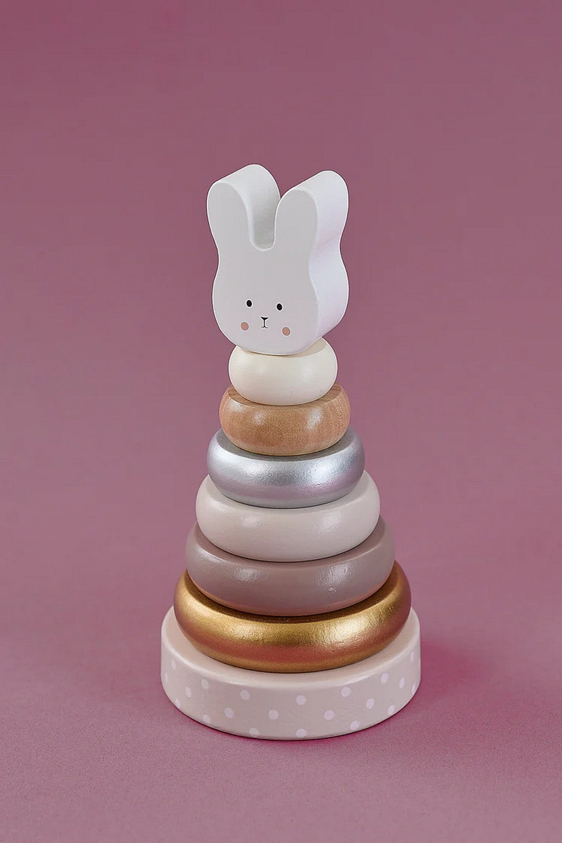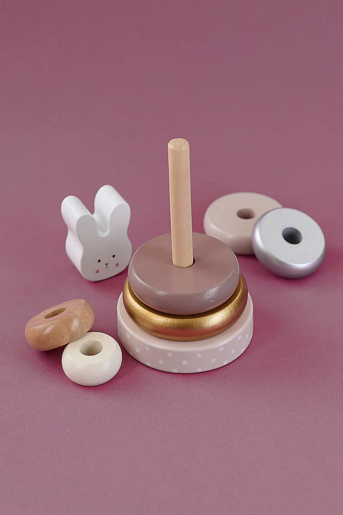 The stacking tower is a classical must-have-toy for all the little ones. This stacking tower have different colours and is decorated with a wooden Bunny at the top. This toy will promote the child’s understanding of shape, colour and size differentiation. It also develops the child’s hand eye co-ordination and fine motor skill. The stacking pole is bendable for highest safety.