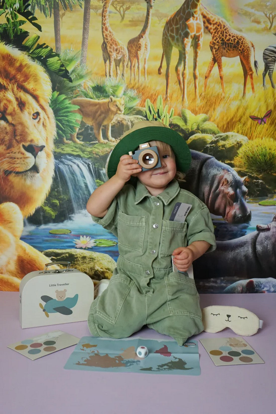 Now you can finally pack your own bag when it's time for holiday. Our bag contains the most important things you need for the journey, long or short. Here you will find a passport, ticket and your own camera with a prism so that you can photograph your entire trip. If it is a long journey, there is an eye mask so that you can easily doze off and wake up just in time for arrival. There is also a map so you can see where you are going, and if you get bored there is a fun balloon game that you can play with your friends along the way. To play the game, roll the dice and put the right coloured tile on the matching coloured balloon. First one to fill the game tiles with balloons wins. Have a nice trip!