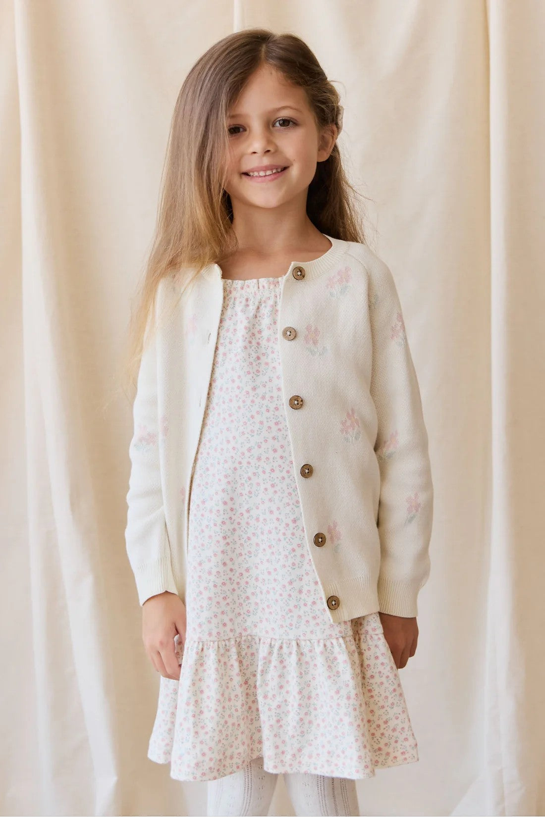 The Meadow Cardigan – Larissa Egret is a beautifully knitted piece in a soft white tone, adorned with delicate floral accents. Featuring a round neckline and five charming brown buttons down the front, this cardigan adds a dainty and timeless layer to your little one’s wardrobe.