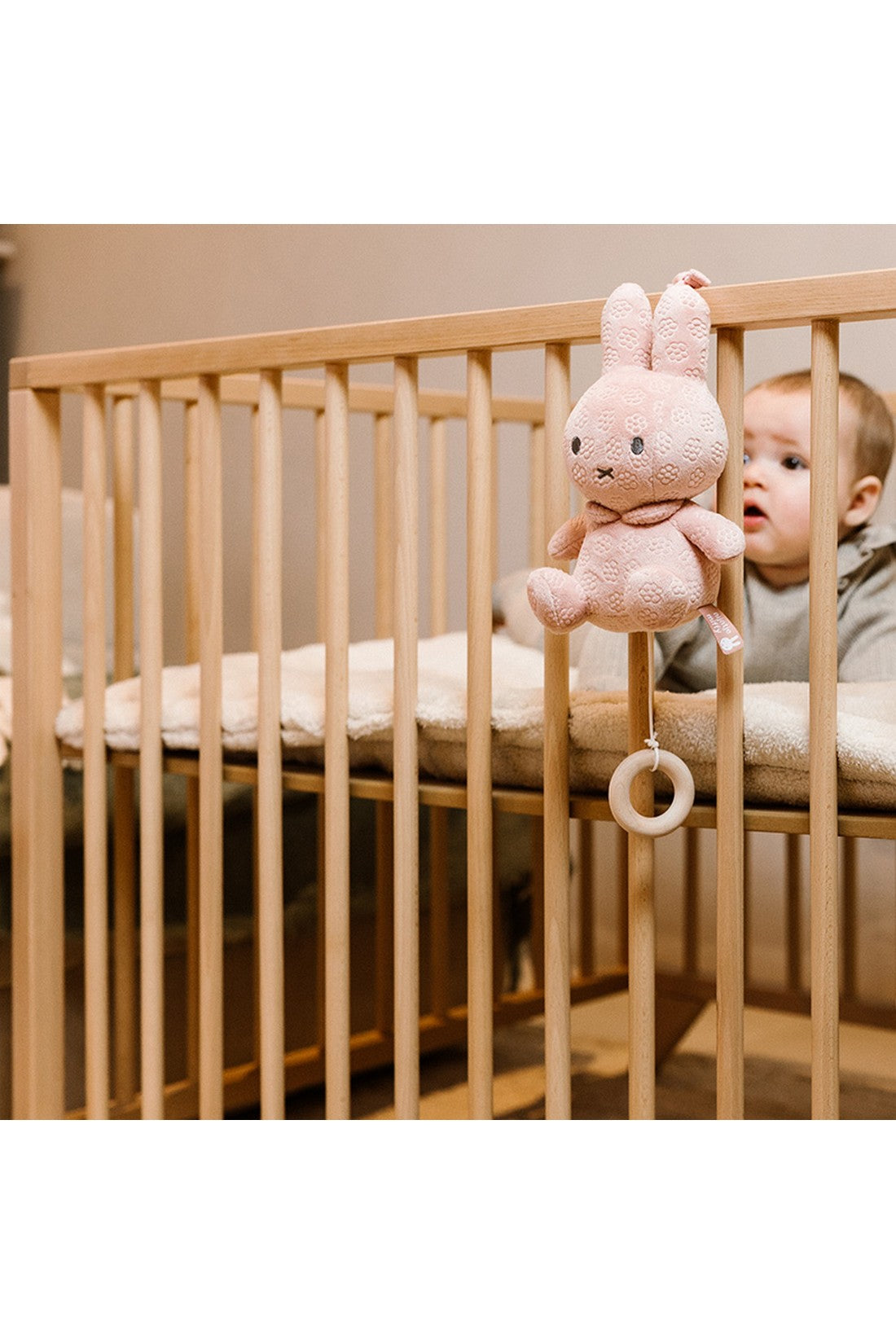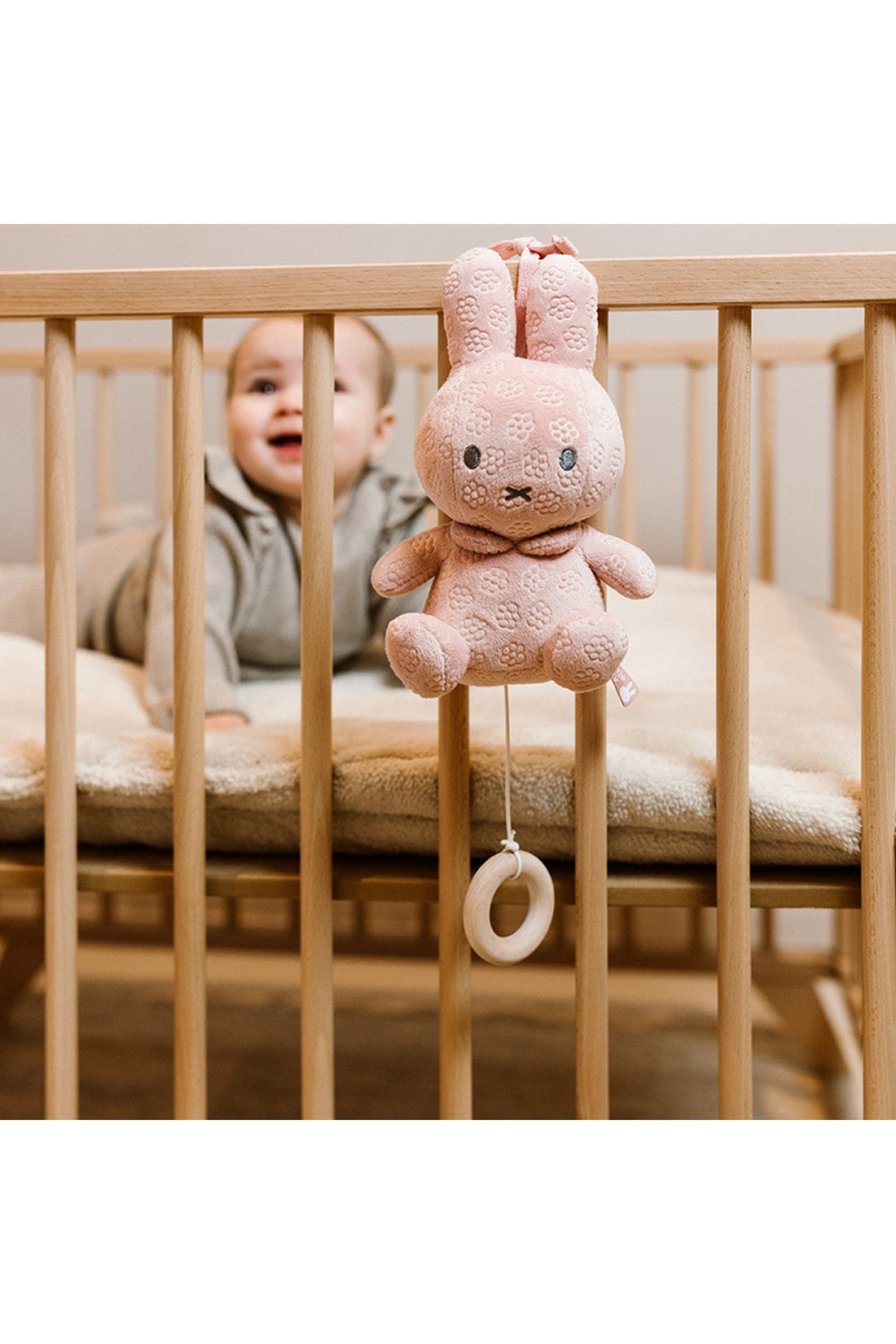 Miffy, sweet little bunny. Play the melody of the well-known Miffy tune by pulling the string. Due to the soft fabric, in which punched flowers are incorporated, this music box is a real asset for the crib or playpen. The music box is easy to attach using the loop.