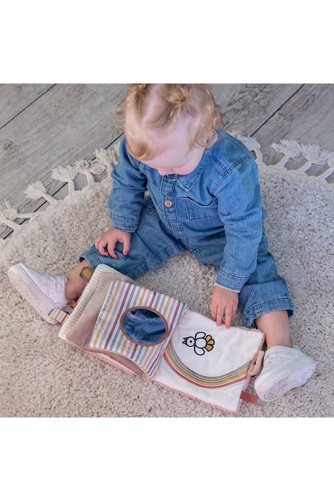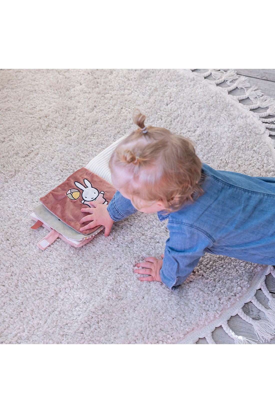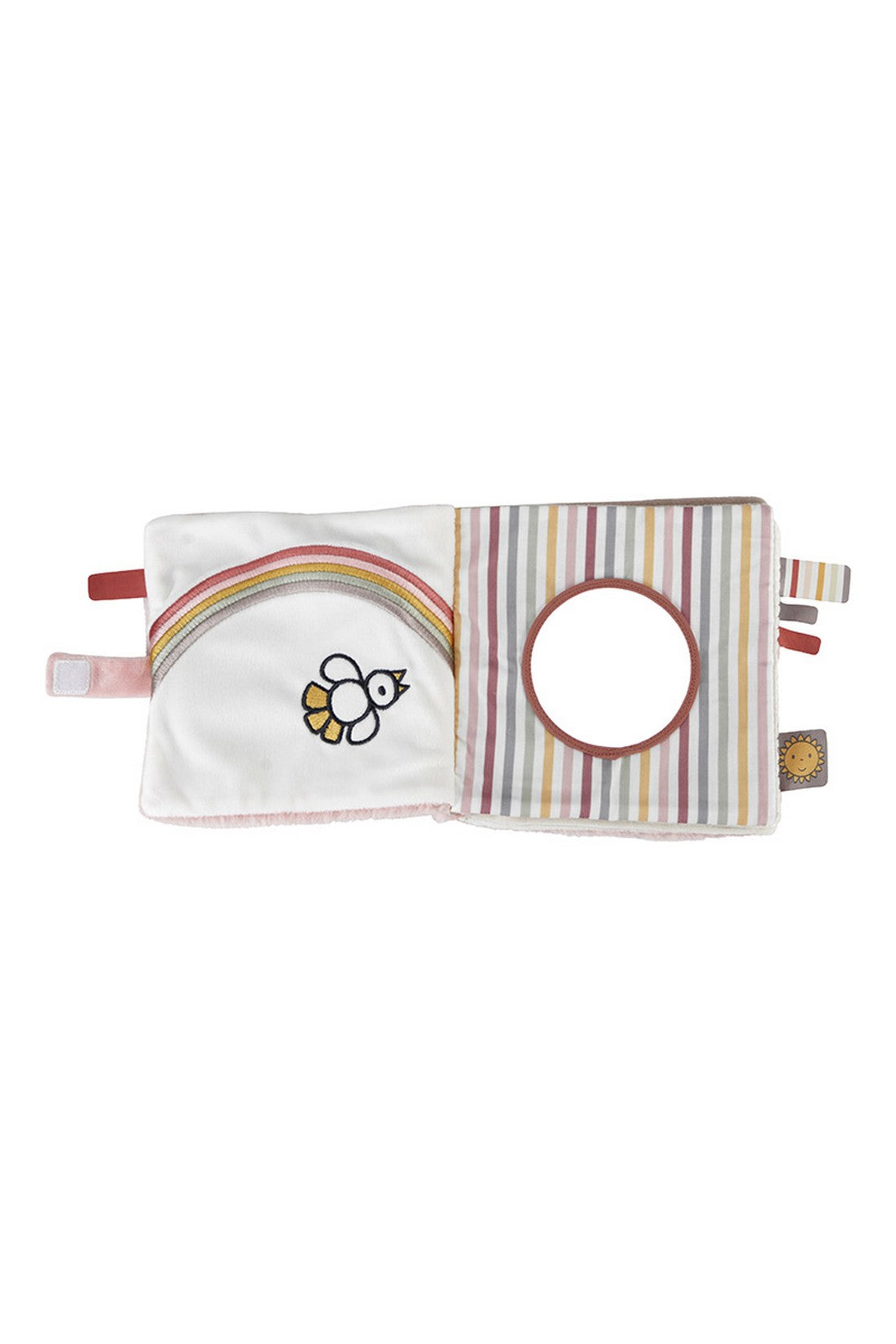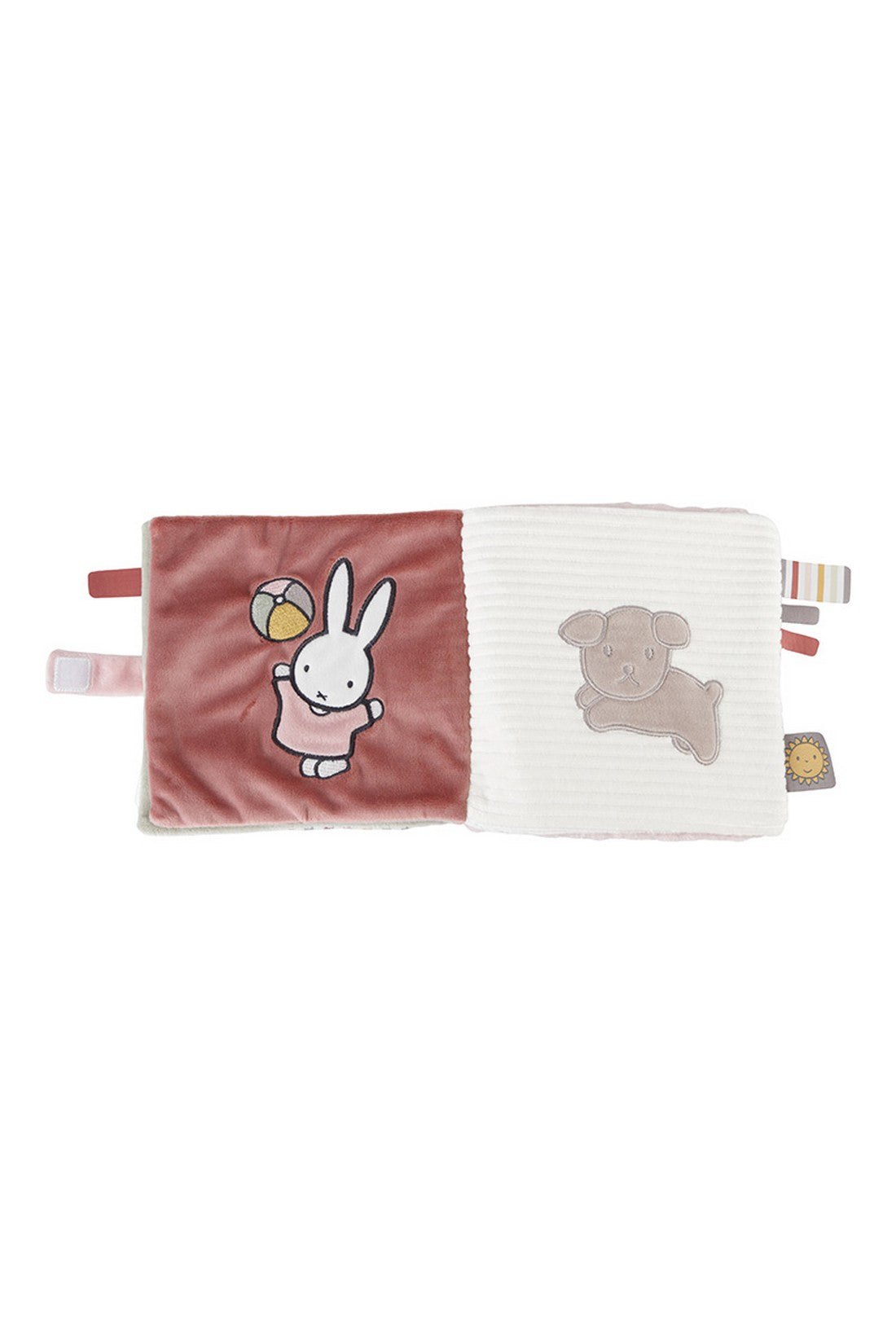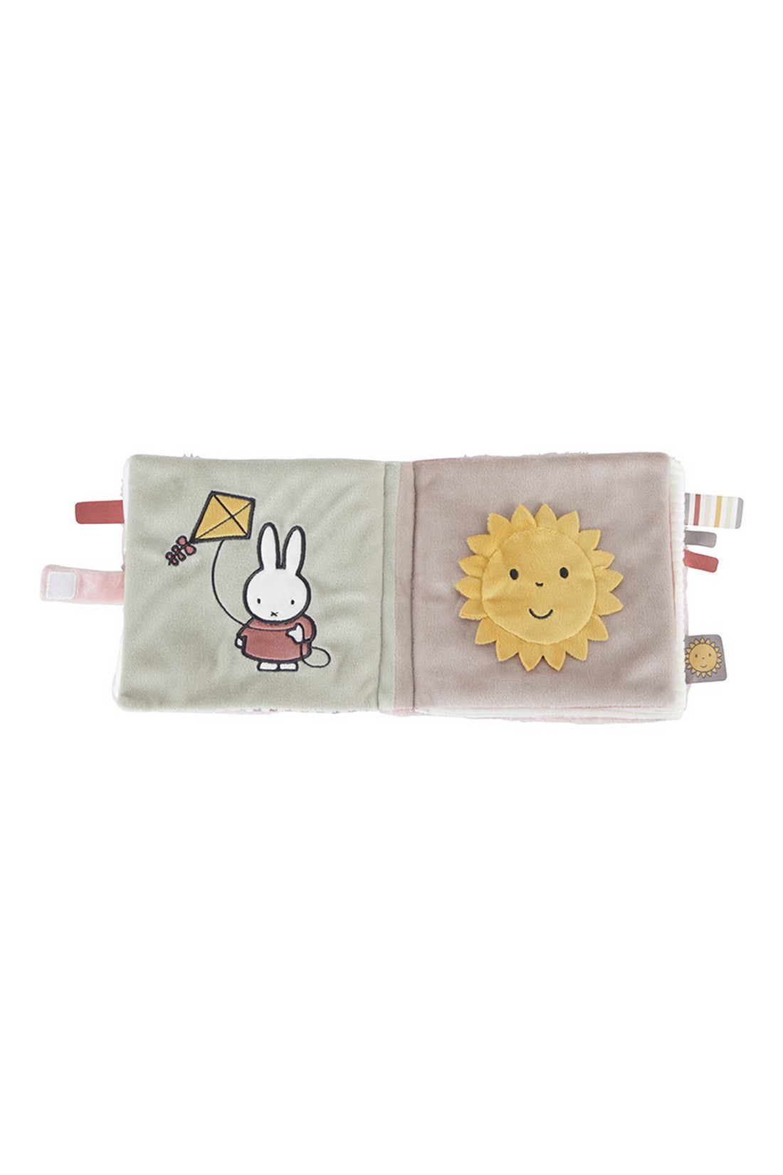 This cheerful miffy book is full of surprises! The booklet is easy to hold and is extra soft due to the fluffy fabric on the cover. There are many activities to discover such as crisp paper, a mirror, a flap and labels to feel. Different types of fabric have been used. There is a small loop on the booklet to attach it to something.