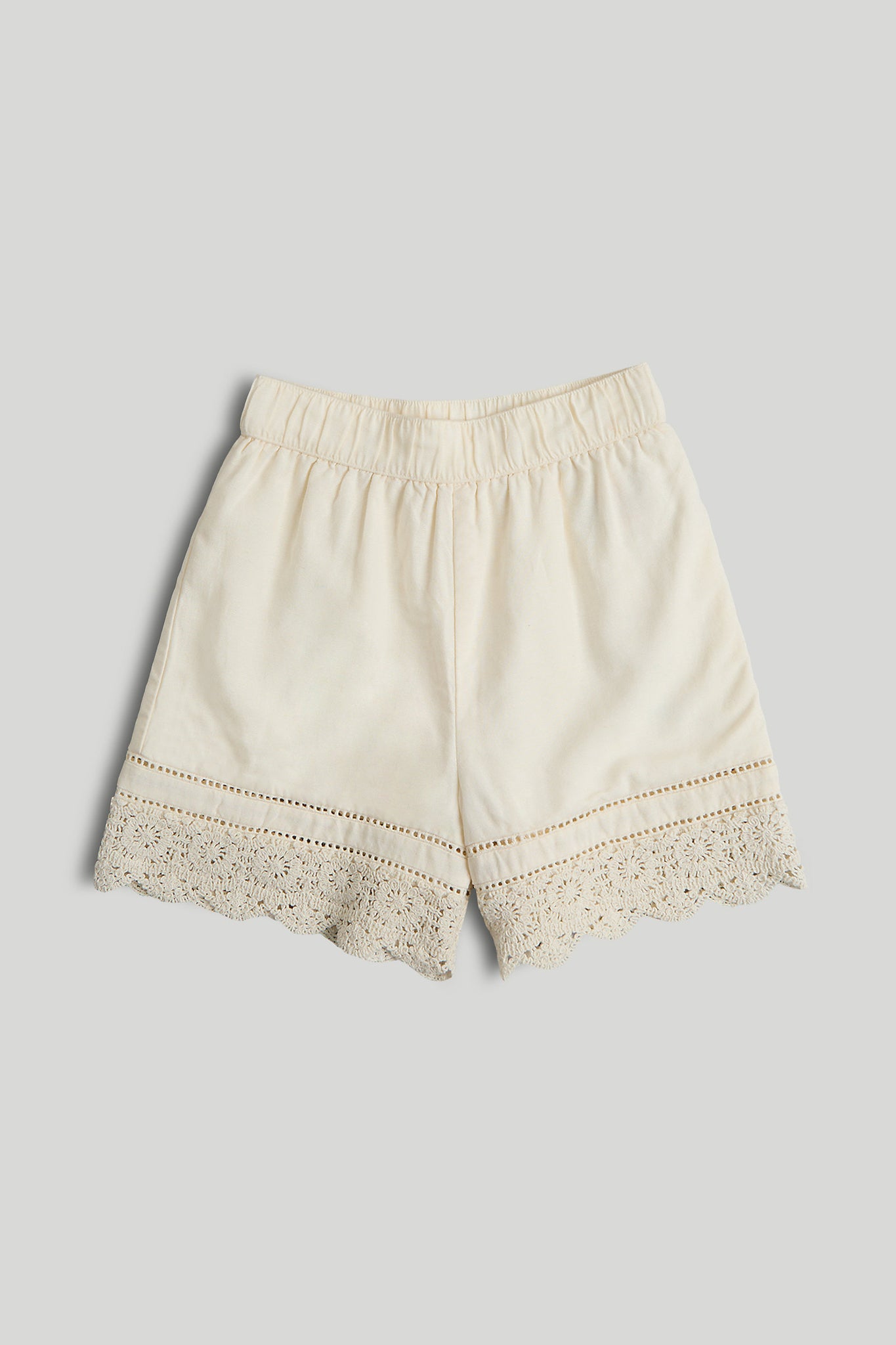 Ladder lace inserts and delicate crochet trim make these pull-on shorts a standout favourite for the season. A fully elasticated waistband offers a flexible fit and all-day comfort.