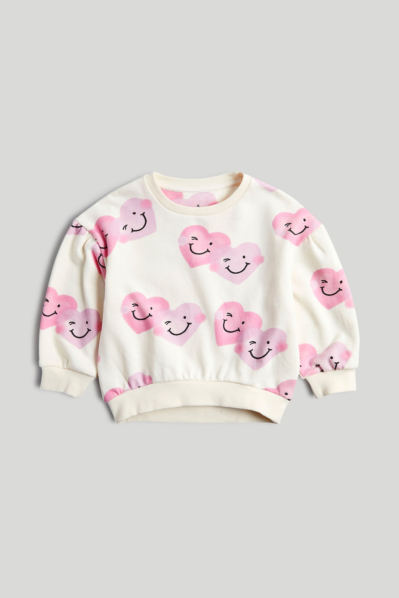 Crafted from cotton-rich fabric for a soft and breathable feel, this sweat top is made with dropped shoulders for a relaxed fit. An all-over pink heart print makes it a layer they'll love.