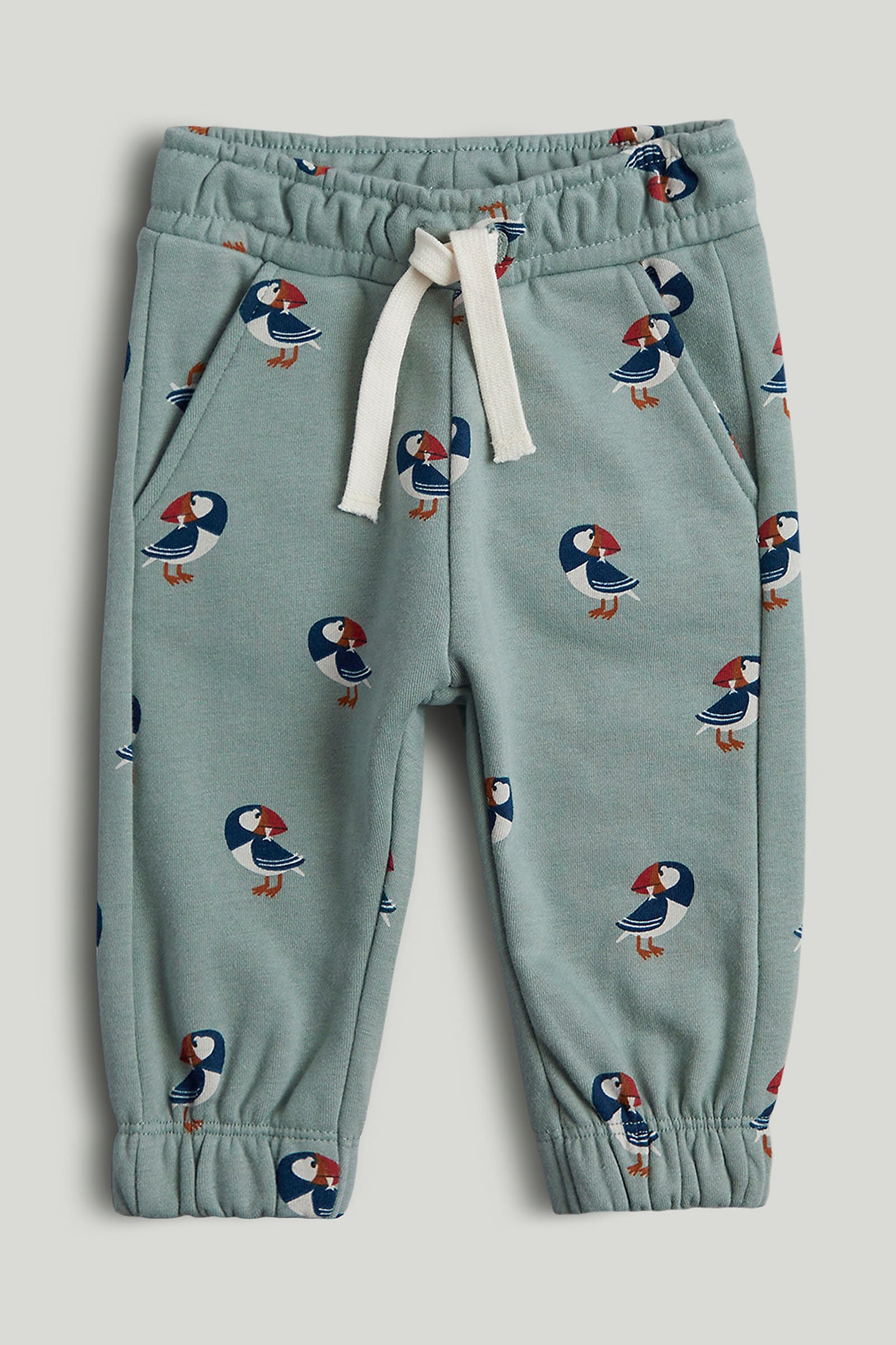 Playful and practical. With a fun puffin print, these joggers are crafted from cotton-rich jersey and are brushed inside so they're soft against delicate skin. The relaxed fit and stretchy waistband make them perfect for crawling, climbing, and everything in between.
