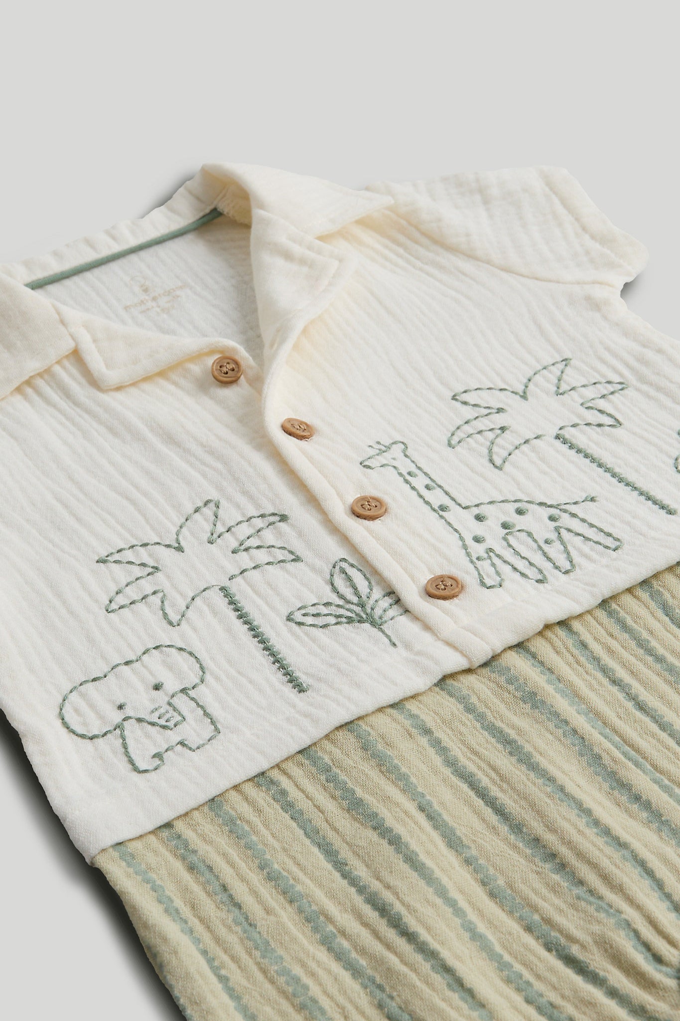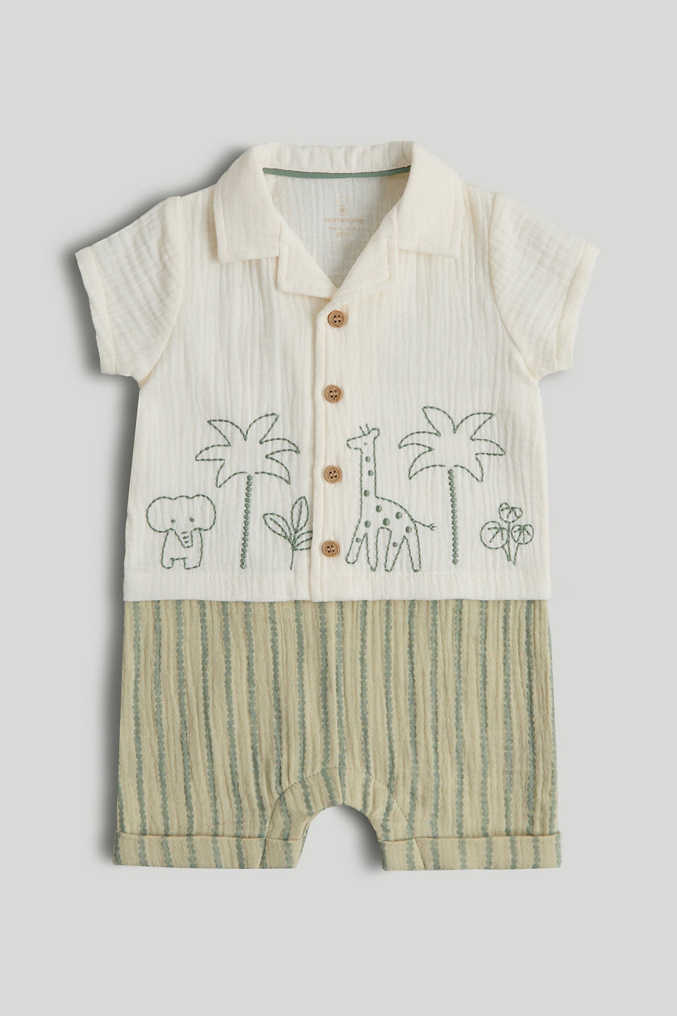 Designed to resemble a separate shirt and shorts, yet offering the comfort and convenience of an all-in-one, this romper outfit is crafted from lightweight and naturally breathable cotton, ensuring it feels cool and comfortable.