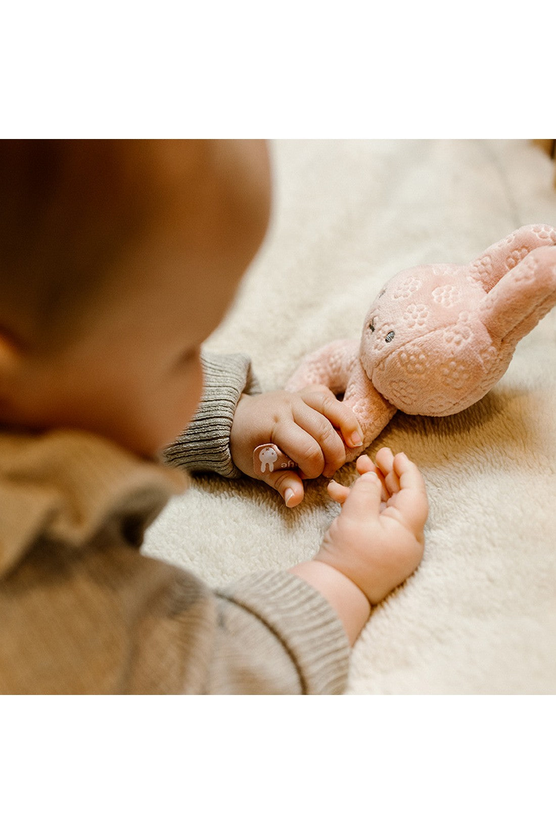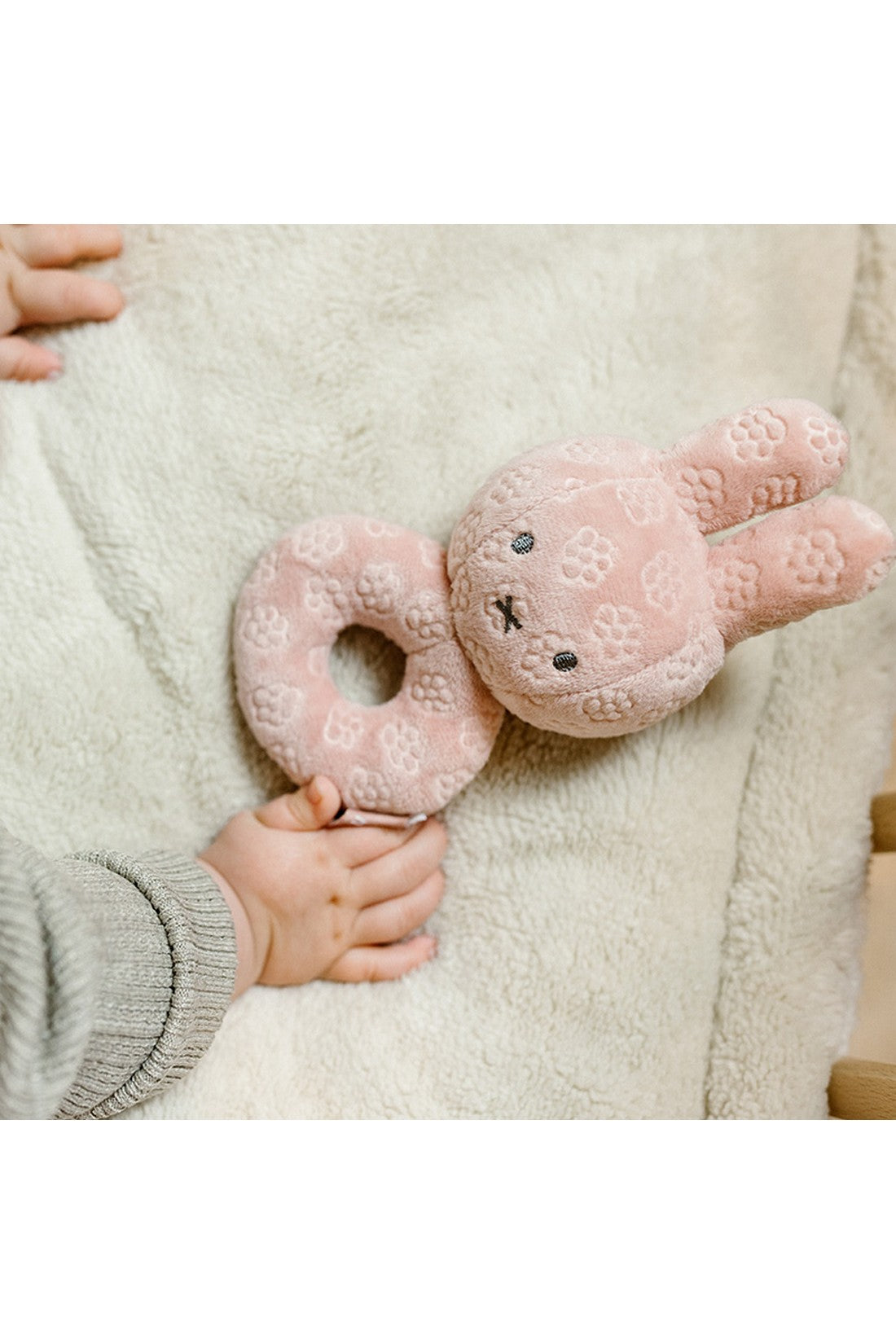 This miffy rattle can easily be held by small children's hands and is therefore very nice as a first toy. Inside the rattle is a bell that stimulates your child's senses. The rattle is made of soft fabric, in which punched flowers are incorporated, for a cheerful and soft look.