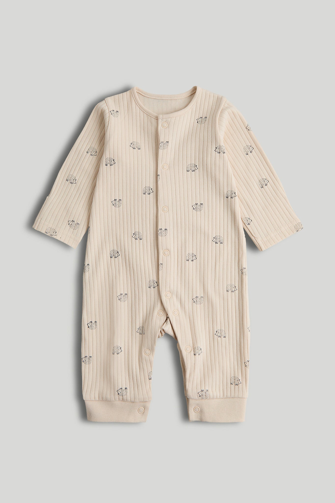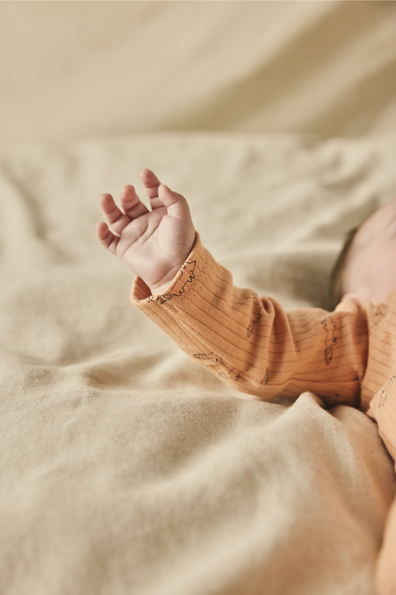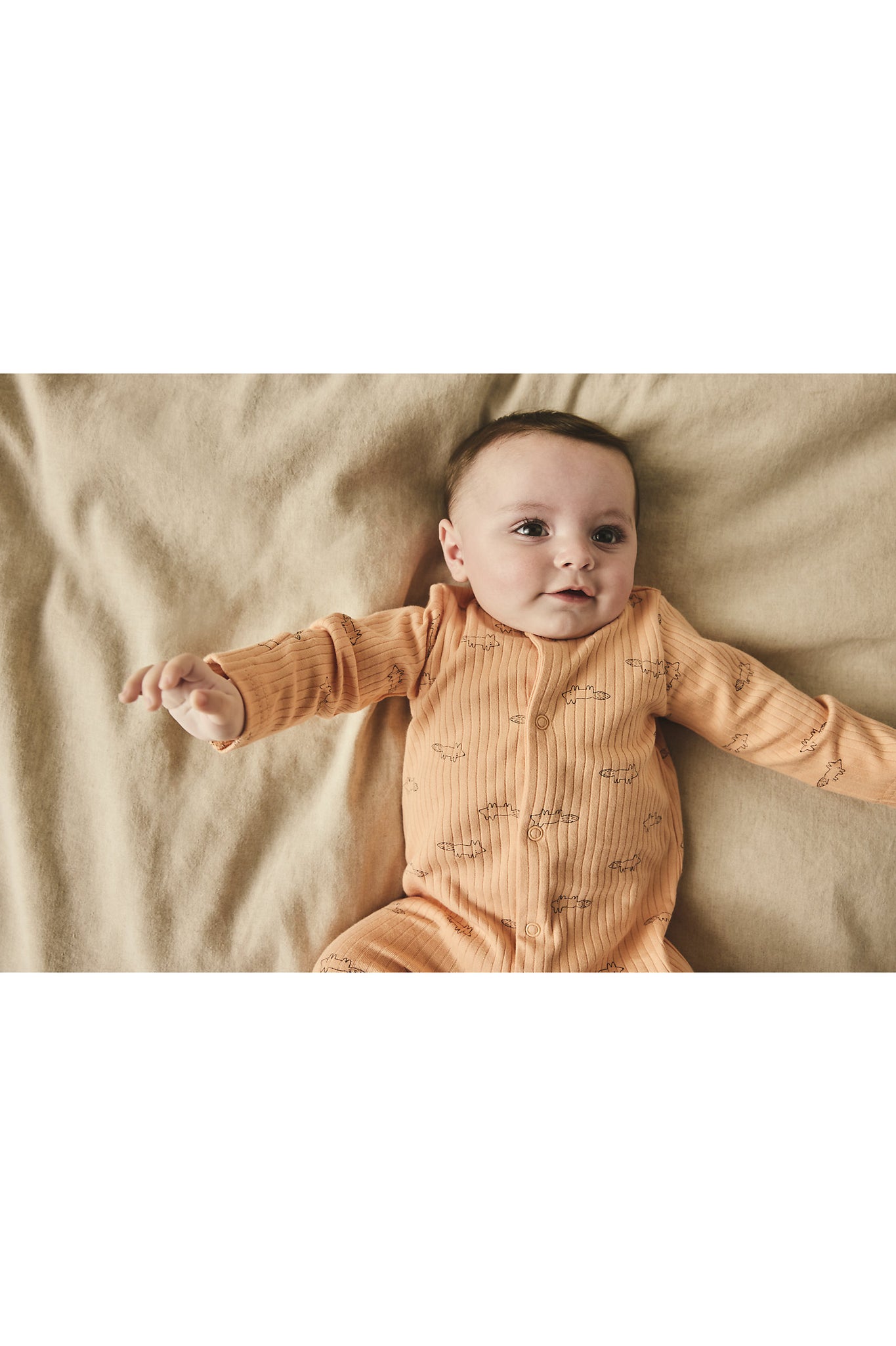 Soft cotton and modern linear prints come together in these footless sleepsuits, designed for easy dressing and all-night comfort. Scratch mitts are ready to tuck tiny hands away, and a copper-coloured popper for guided fastening make changes simple.