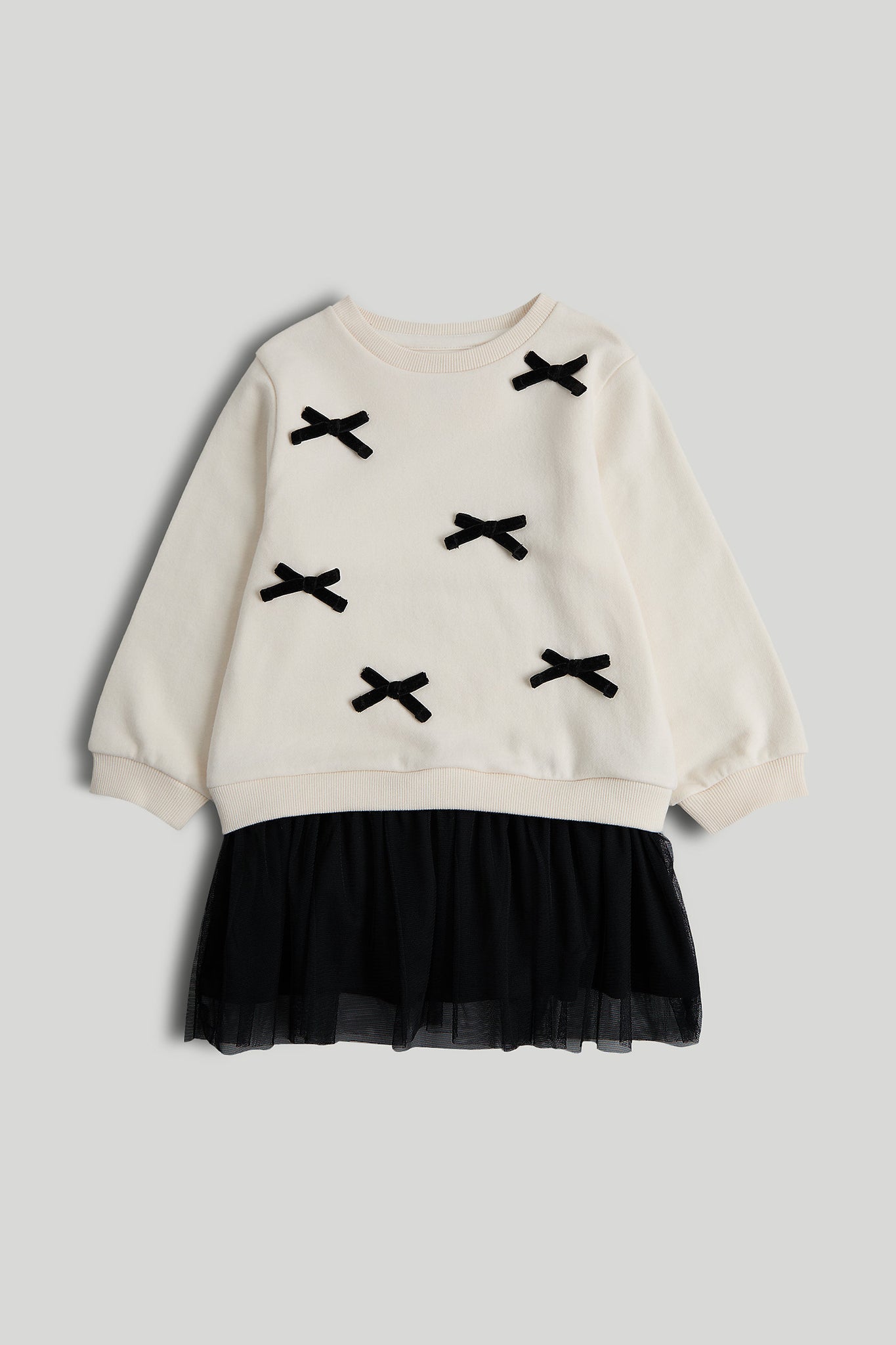 Made for play days and special days, this easy-wear cotton twofer dress brings a touch of fun to any occasion. The cream top features long sleeves and sweet velvet bows, while the floaty black skirt with its soft mesh overlay adds just the right amount swish.