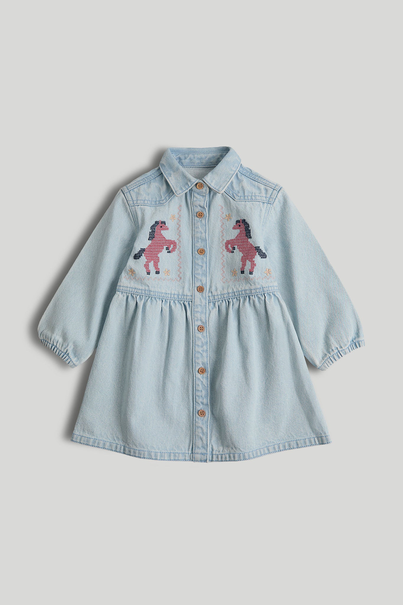 Crafted from natural, breathable cotton denim for durable comfort and shaped to keep up with active days, this versatile shirt-style dress features an embroidered yoke with a wild west influence.