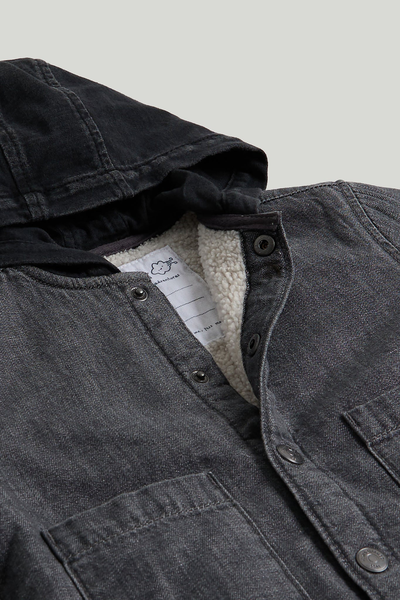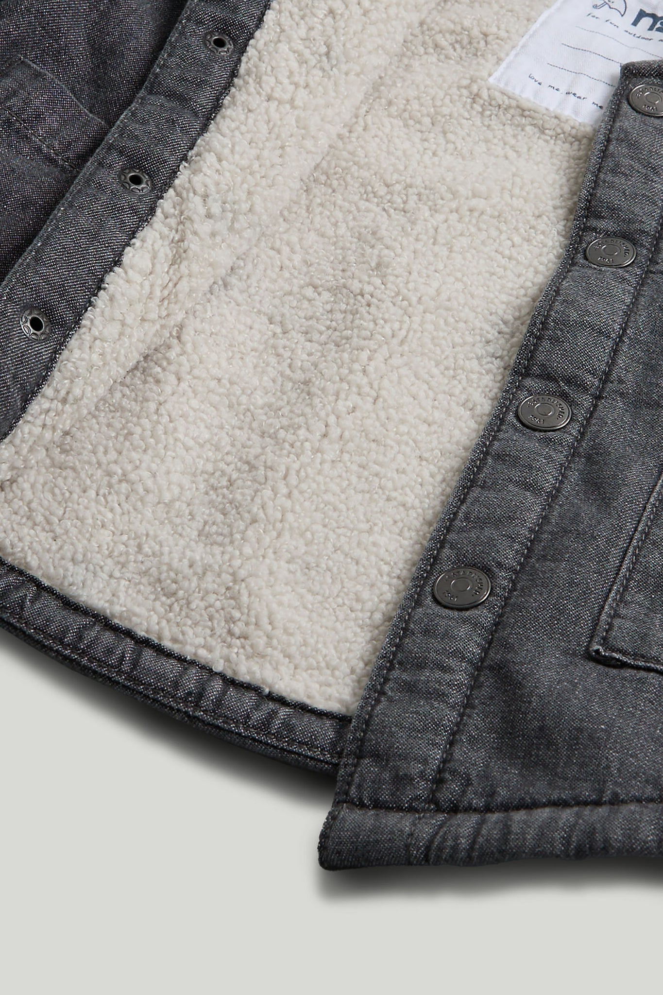 Durable denim in a mid-grey wash and soft, fluffy borg fleece combine to create this cosy layer. A cross between a shirt and a jacket, it works well as a middle or outer layer for outdoor play.