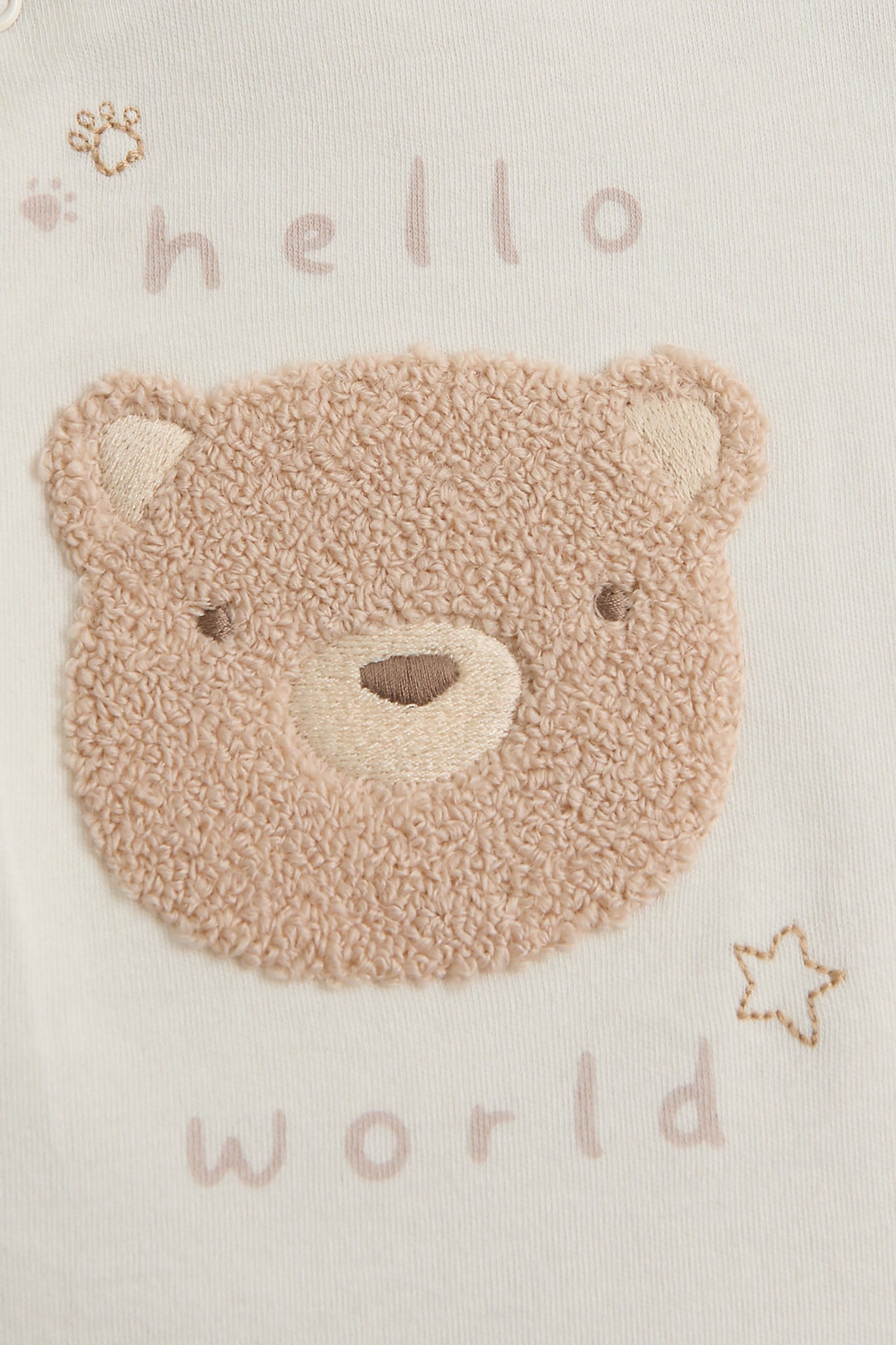 A soft, pure cotton outfit, perfect for first days and first cuddles with your baby. Carefully made with full popper fastening for dressing and nappy changes, this all-in-one features a furry bear character and is completed with a coordinating cosy hat. Hello World.