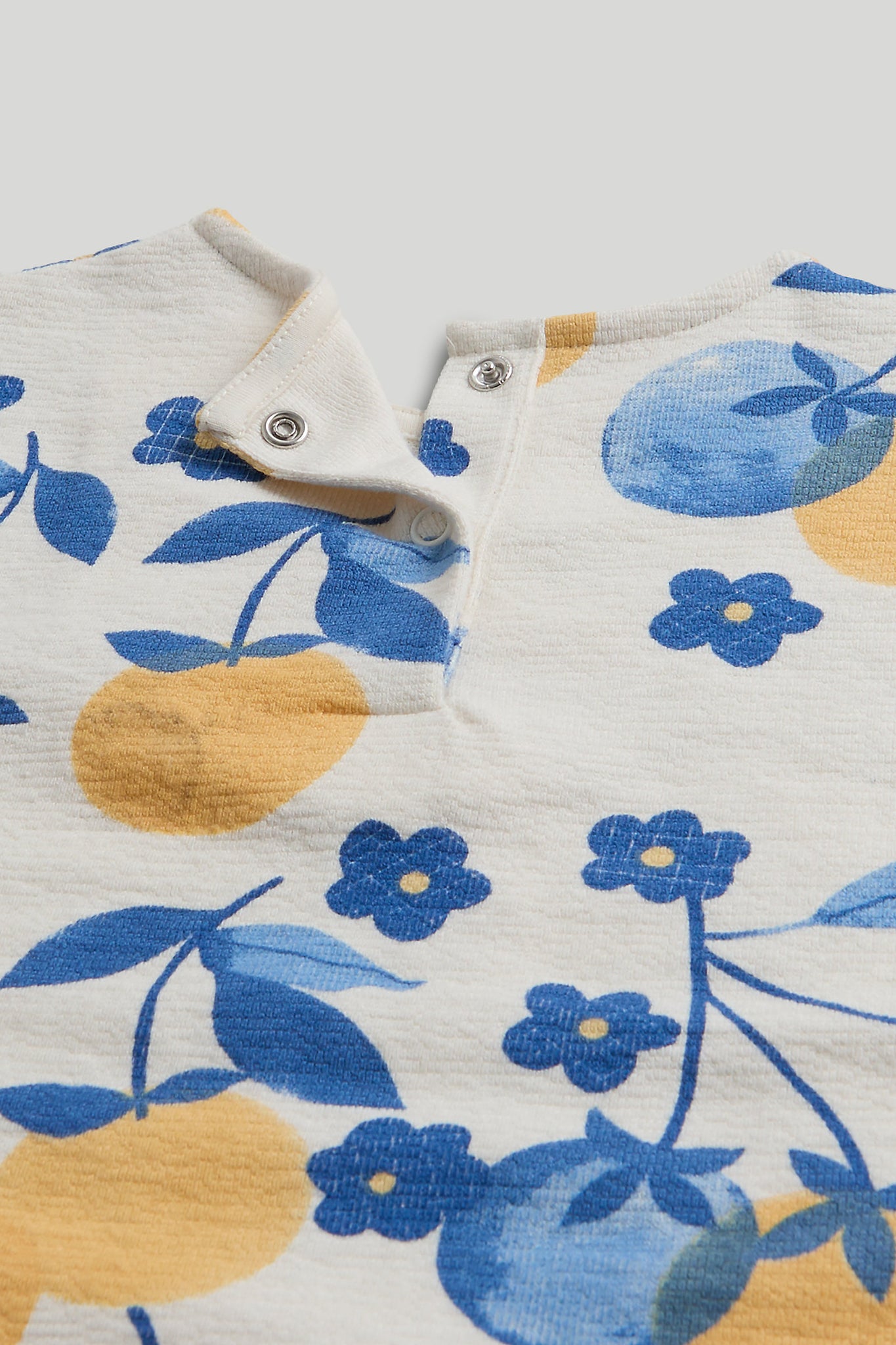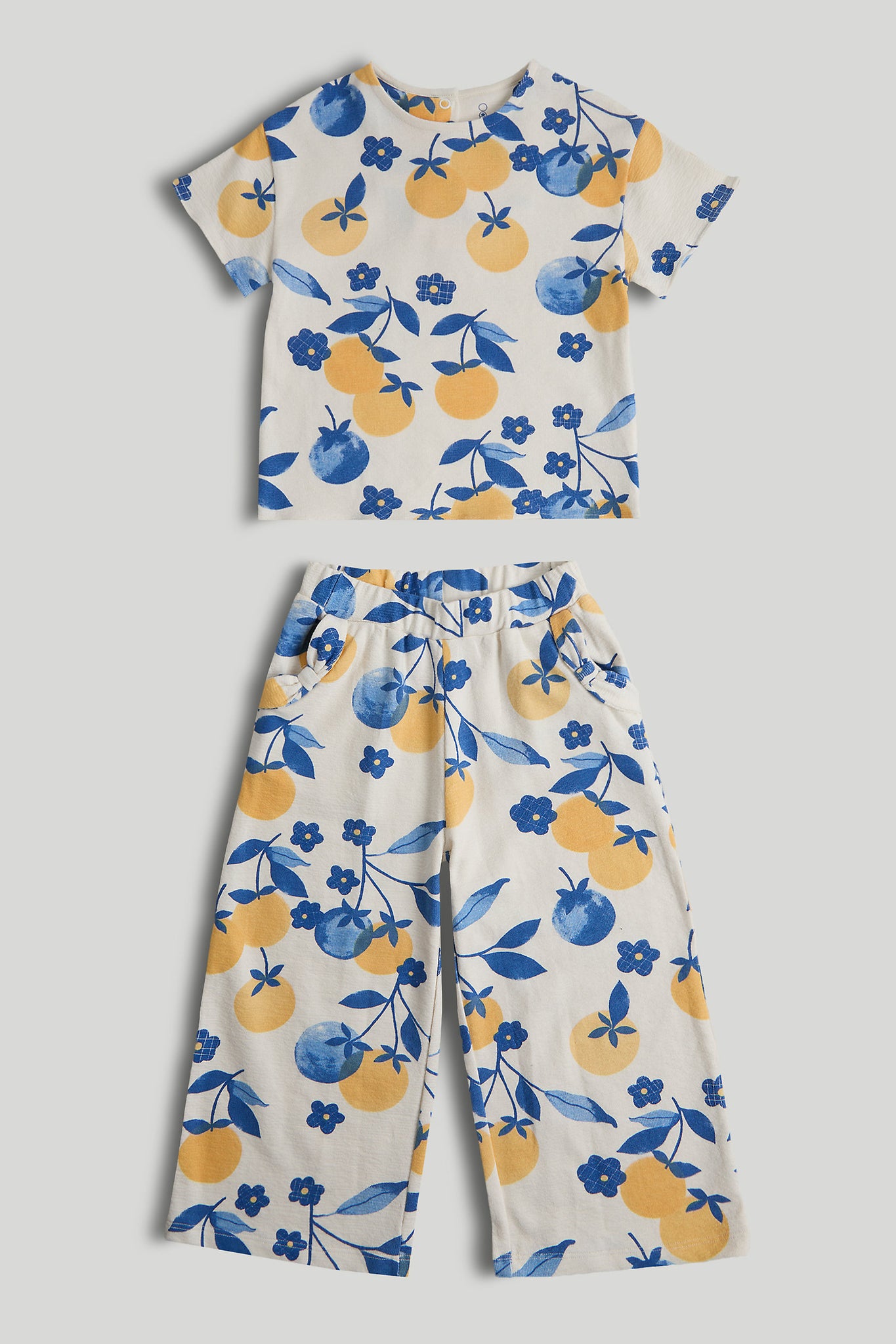 This cotton outfit set includes a boxy, relaxed-fit short-sleeve top and wide-leg trousers with an easy elasticated waistband. Both pieces are decorated with an all-over orange fruit print for a fresh and comfortable everyday look.