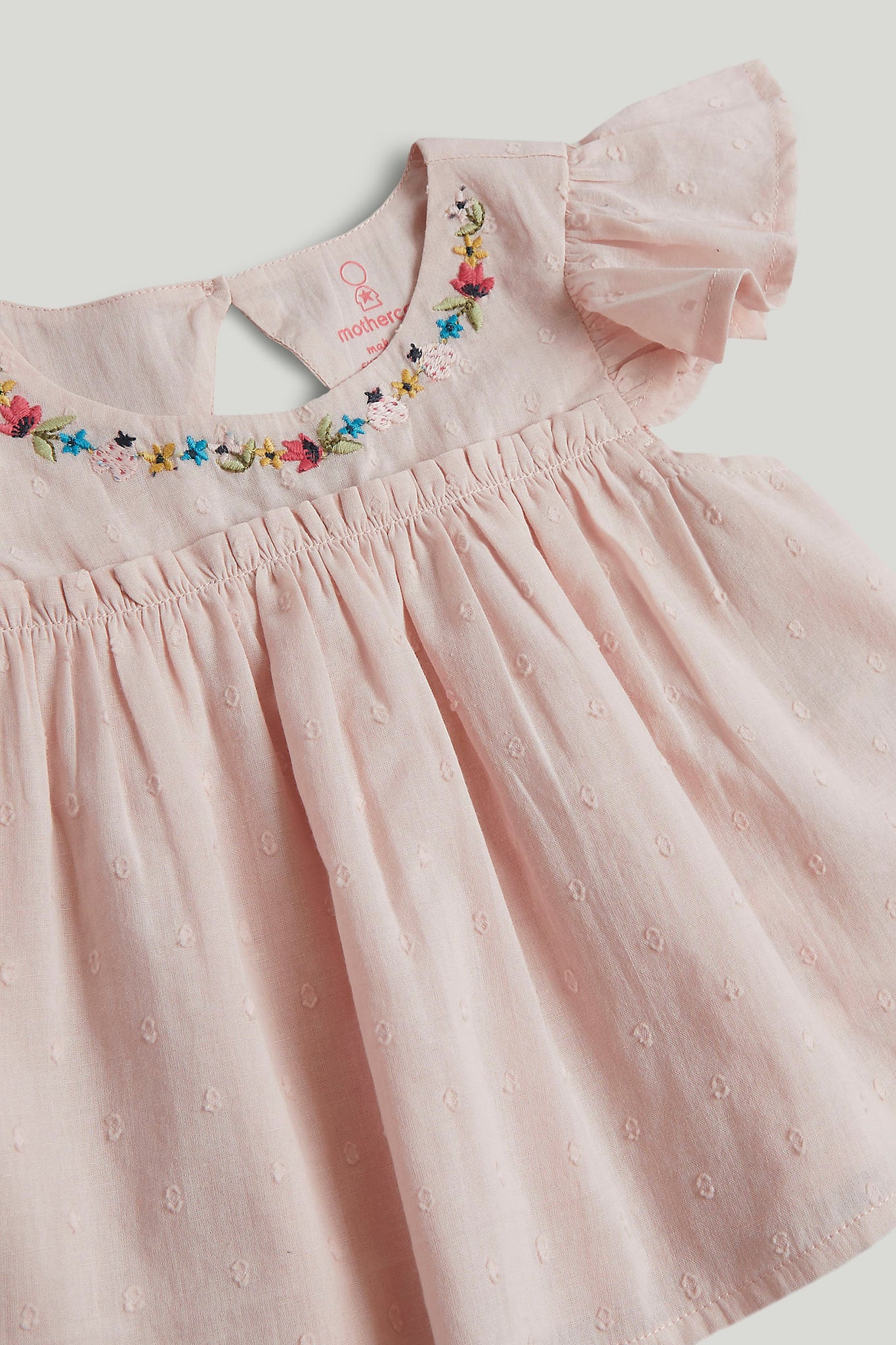 Crafted from naturally breathable cotton, this blouse features delicate frill sleeves and intricate embroidery, offering effortless comfort and style all day long.