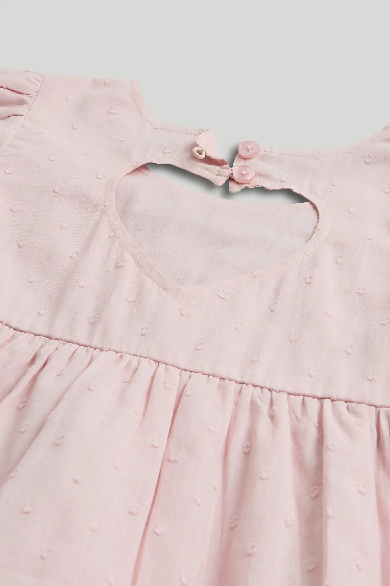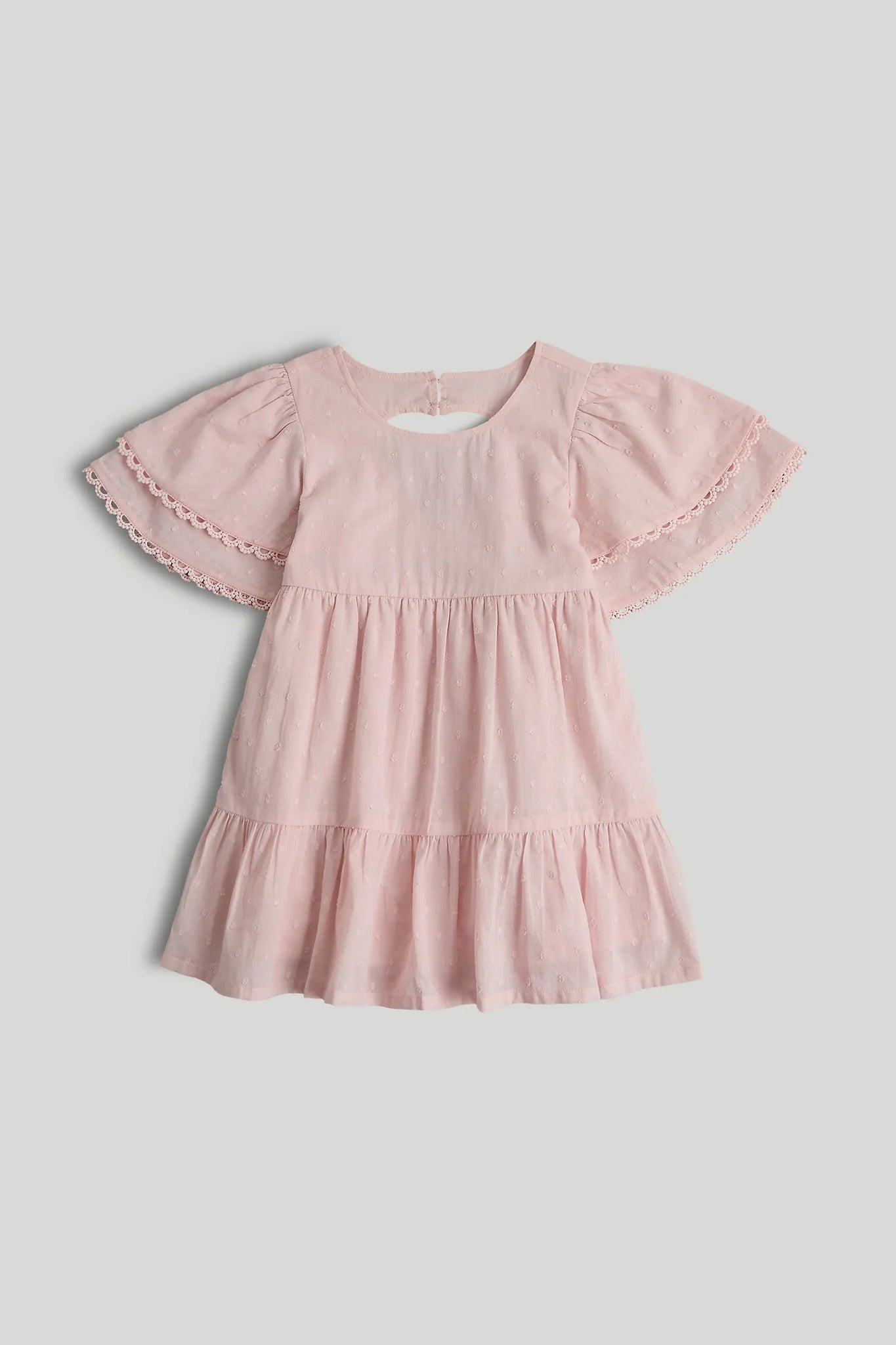 A fresh look for their wardrobe, this dress is crafted from soft, textured cotton thats gentle on delicate skin. Designed with a tiered skirt, flutter sleeves, and a sweet heart-shaped cut-out at the back, its as playful as it is comfortable.