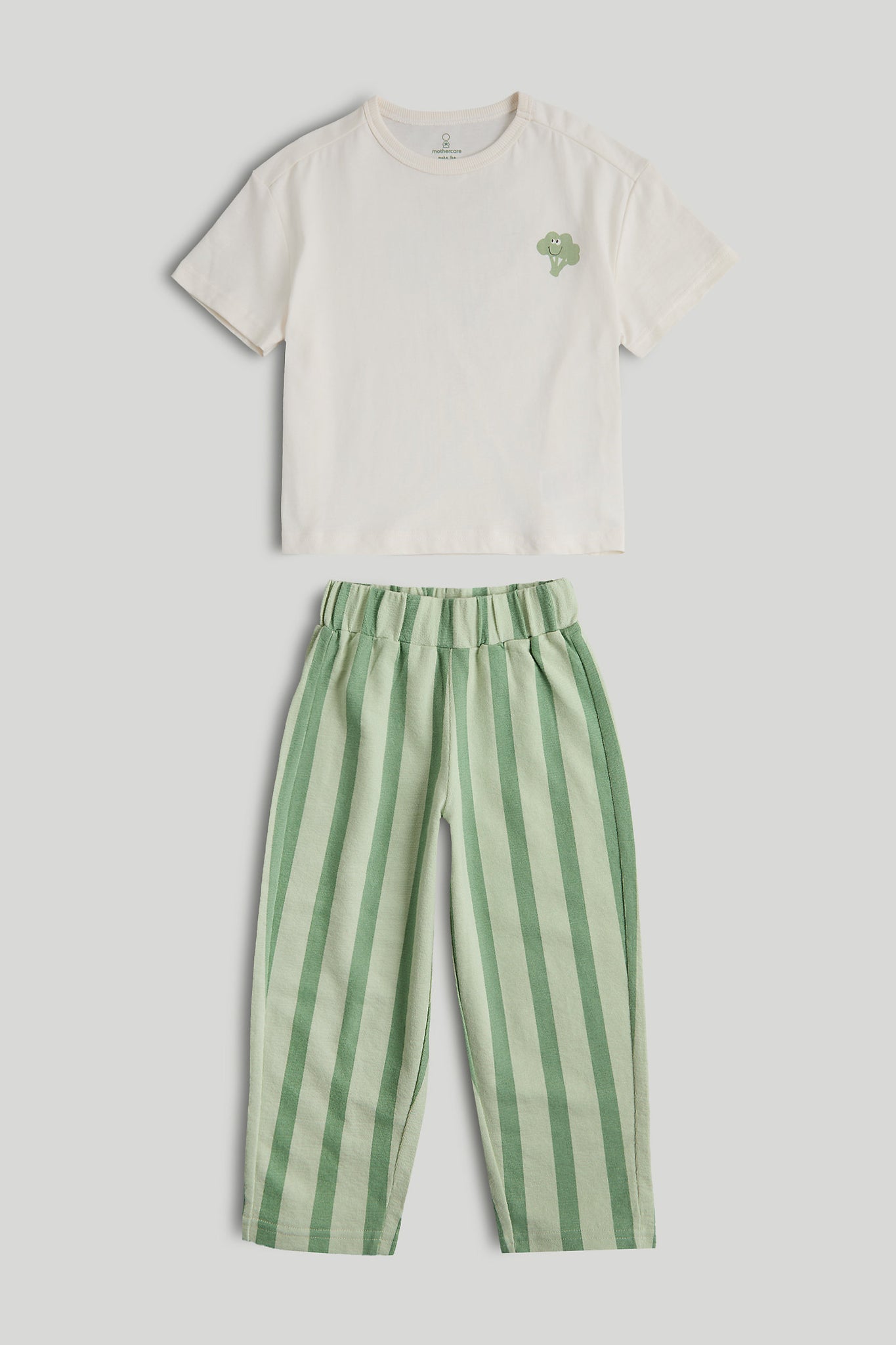 A coordinating outfit set to add some fun to their new-season wardrobe. With a broccoli character print, the comfy crew neck tee layers easily over the striped pull-on trousers. Each piece is carefully designed and made to move.